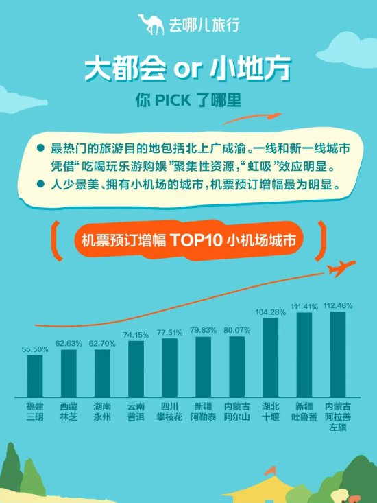 而相对人少景美、拥有小机场的城市,机票预订增幅最为明显。内蒙古阿拉善左旗、新疆吐鲁番、湖北十堰,机票预订量同比增幅超过一倍;四川攀枝花、云南普洱机票预订增逾七成;湖南永州、西藏林芝机票预订增逾六成。