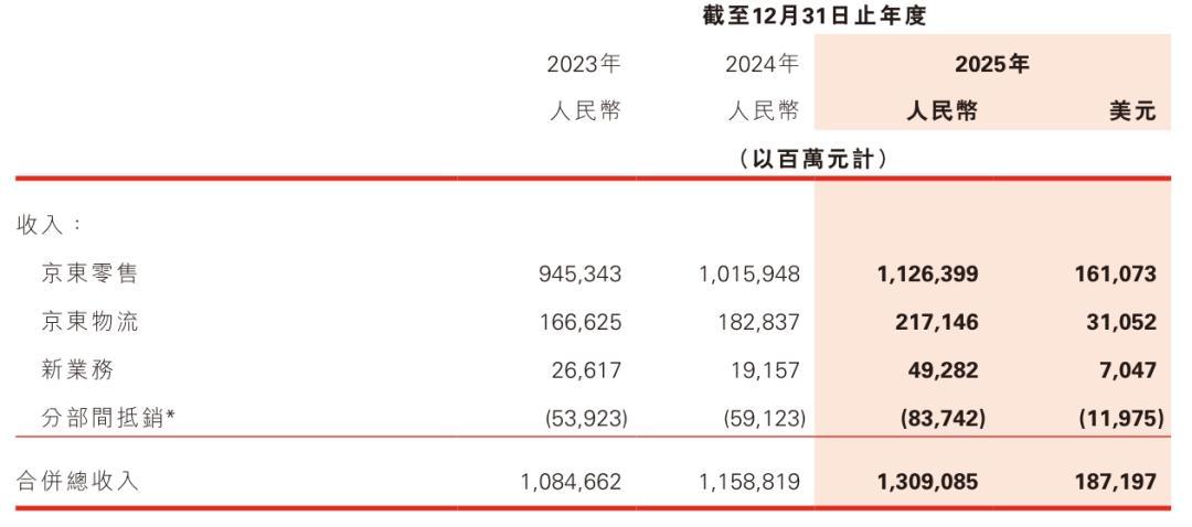 京东2025年来自京东零售的收入为11264亿元(约1611亿美元),京东物流收入为2171.46亿元(约310.52亿美元),新业务收入为492.82亿元(约70.47亿美元)。