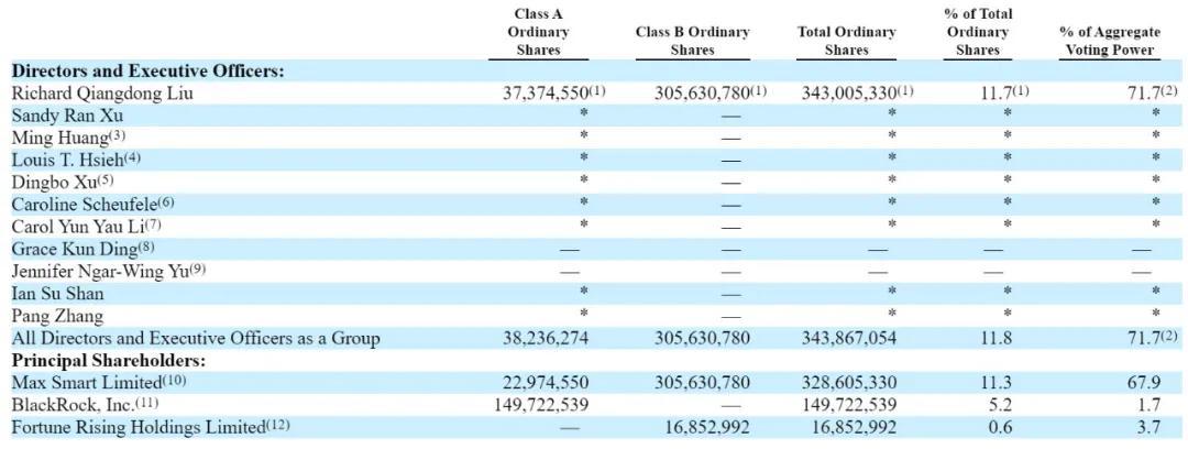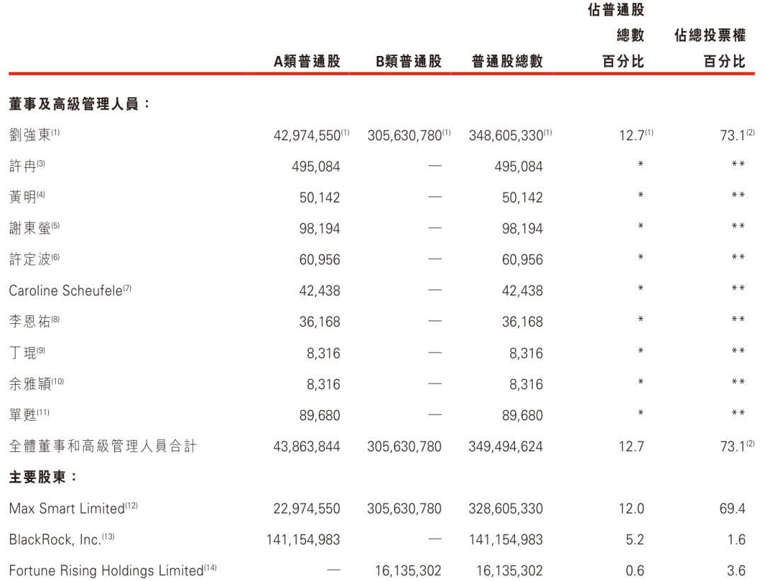 其中,刘强东通过Max Smart持有22,974,550股A类股,305,630,780股B类股,一共有12%的股权,及69.4%的投票权;通过员工持股平台Fortune Rising控制0.6%股权,有3.6%的投票权。