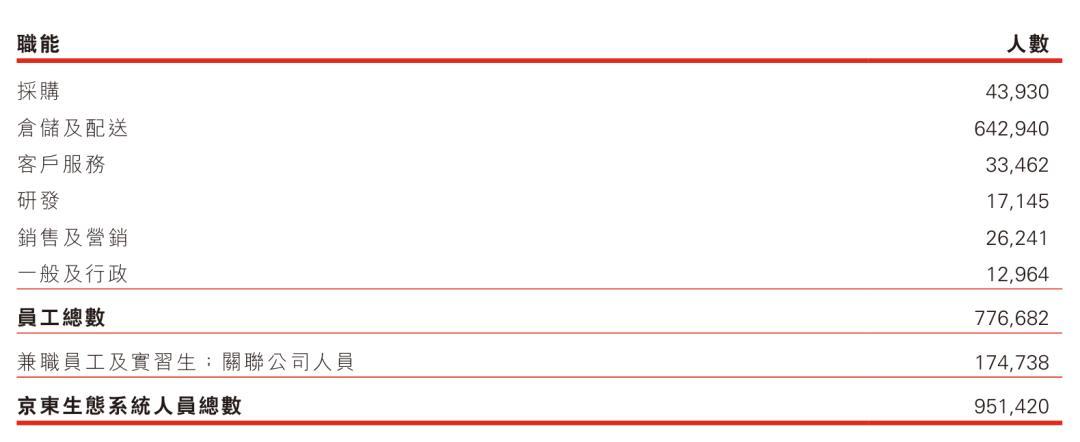 其中,京东采购有43,930人,仓储及配送有642,940人,客户服务人员有33,462人,研发有17,145人,销售及营销有26,241人,一般及行政有12,964人。