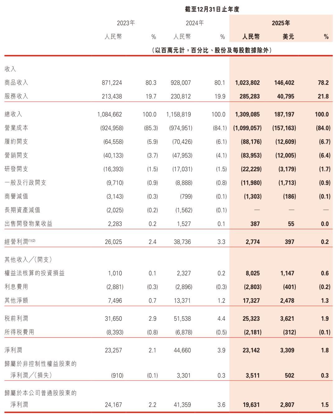 京东2023年、2024年、2025年营收分别为10846.62亿元、11588.19亿元、13090.85亿元(约1872亿美元)。