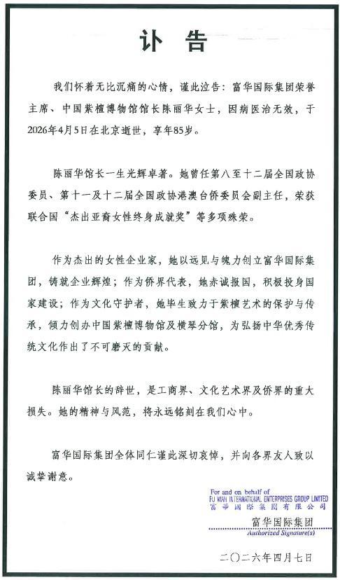 富华国际集团4月7日发布讣告:富华国际集团荣誉主席、中国紫檀博物馆馆长陈丽华女士,因病医治无效,于2026年4月5日在北京逝世,享年85岁。